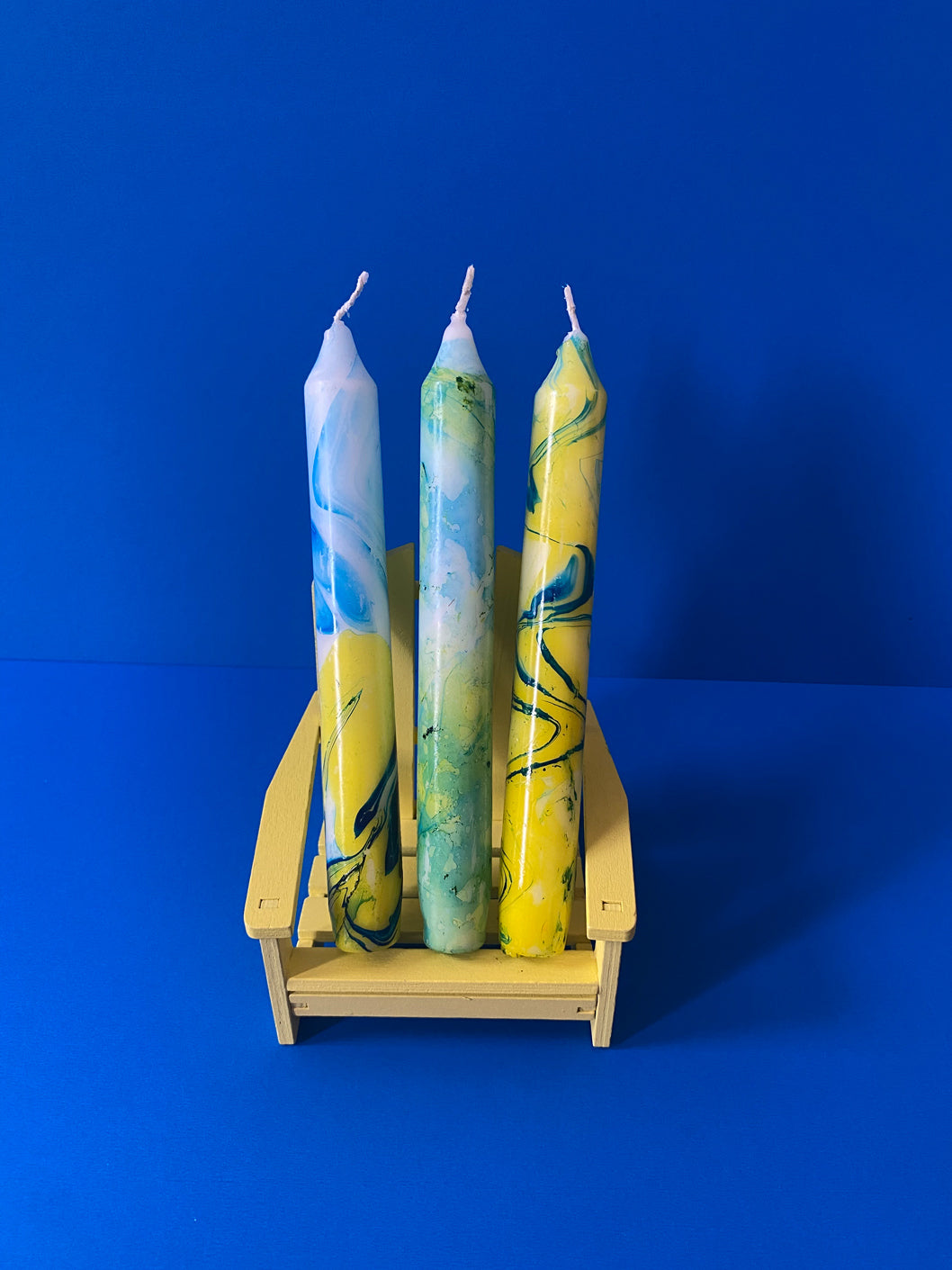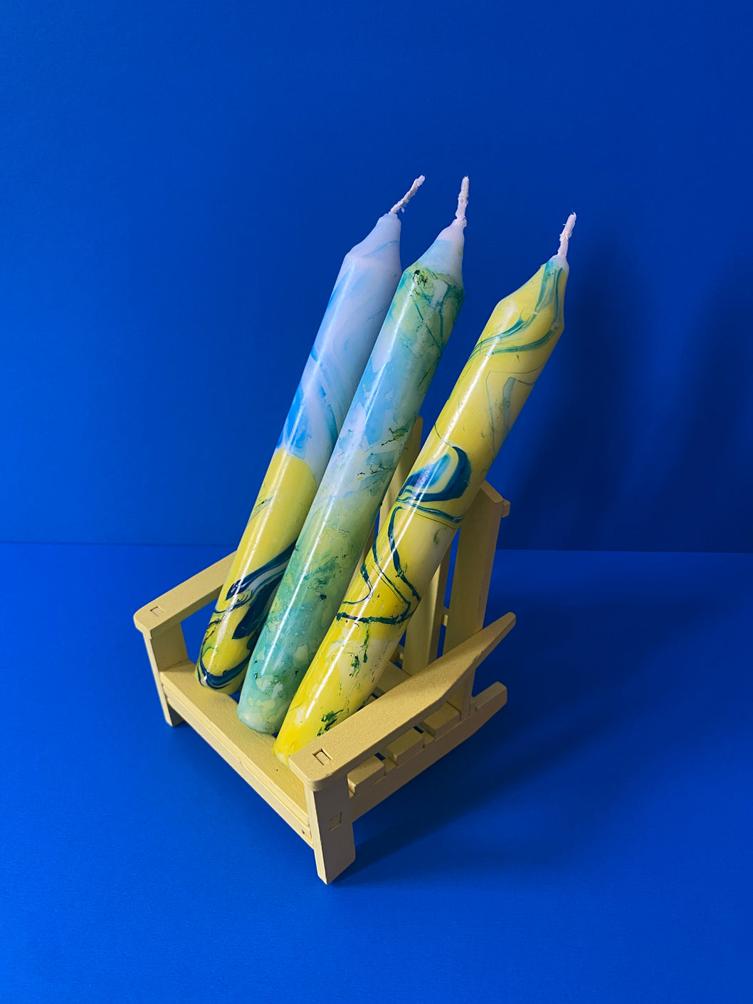 Pack of 3 long unscented candles with a handmade marbled effect. Ignition time: 6h