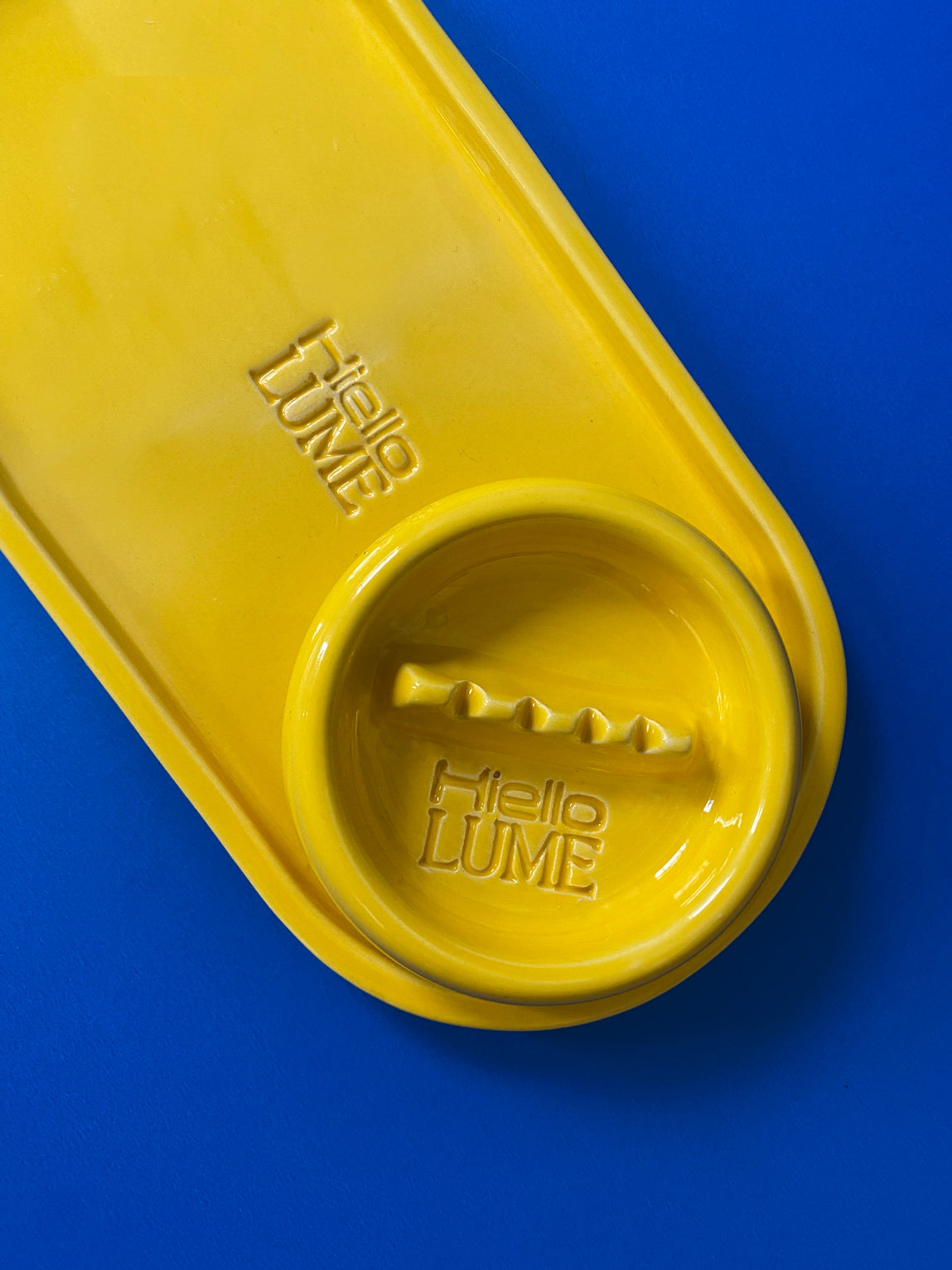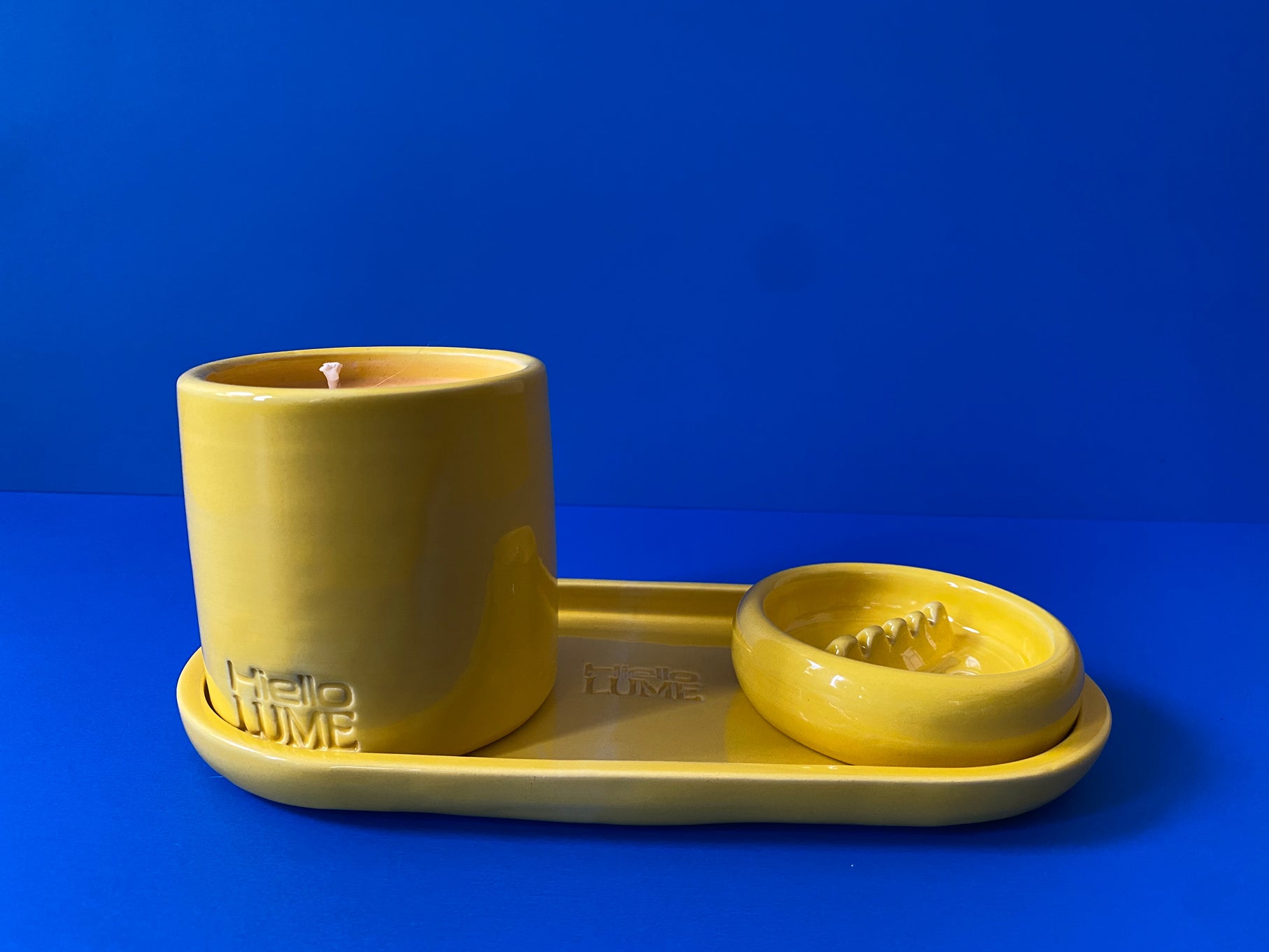 Lemon yellow enameled ceramic candle, tray and ashtray pack, handmade in Barcelona.